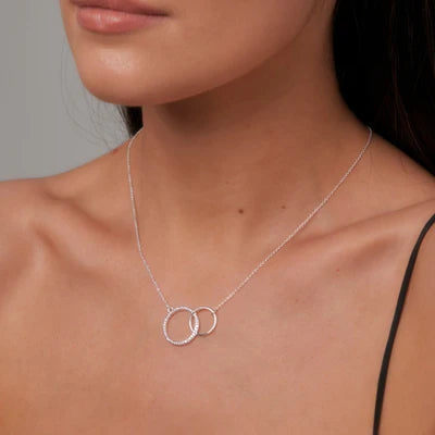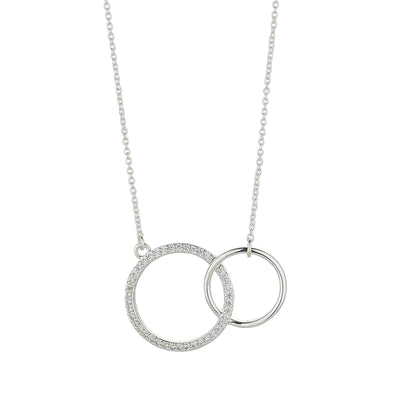 Micro pave rhodium necklace. Interlinking circles one of which is embellished with CZ stones in micro pave setting. Length 16" + 2" extension.