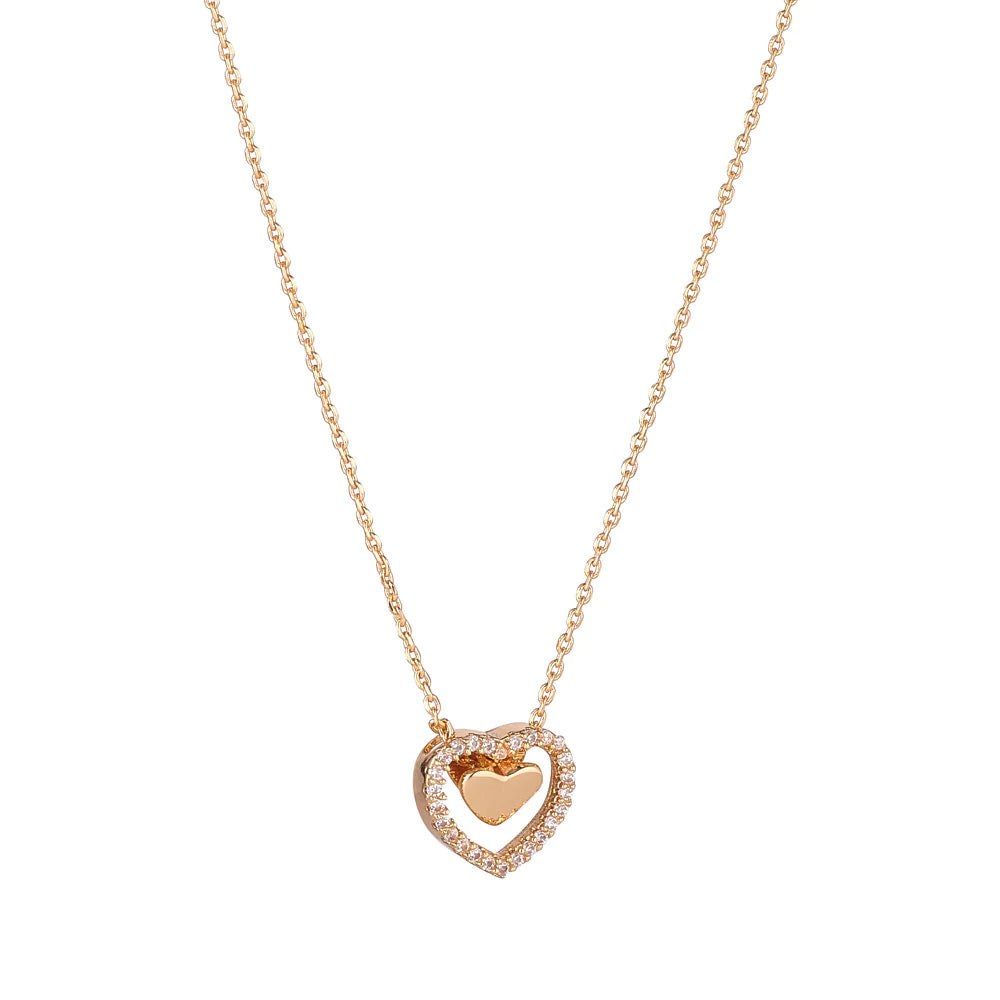 Beautiful fine chain threaded through floating centre heart and outer open heart embellished with CZ stones. Gold plating. Length 16" + 2" extension.
