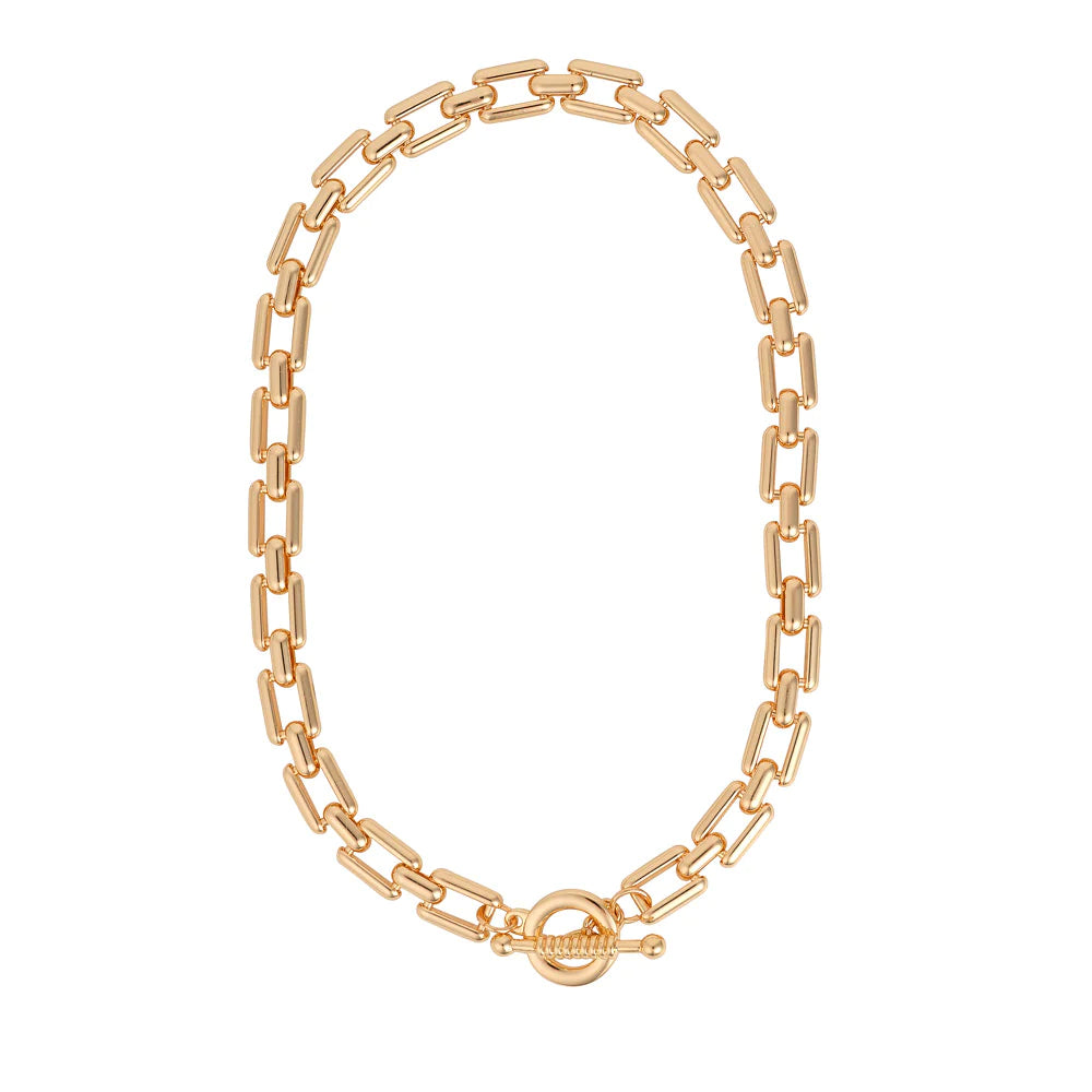 Chunky gold plated chain necklace with ring & toggle front fastening. Length 46cm.