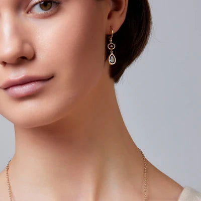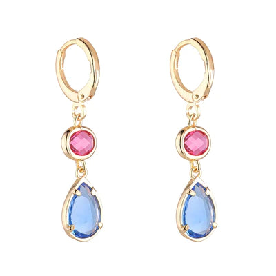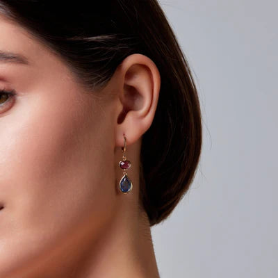 Fuchsia & sapphire drop earrings with neat hoop fastening. Length 3.5cm.