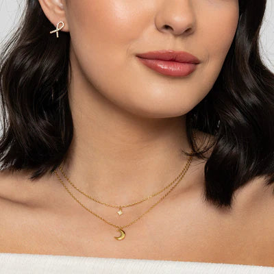 Miniature moon & star on layered chains. 18K gold plating. Length 15" + 16" + 2" extension.