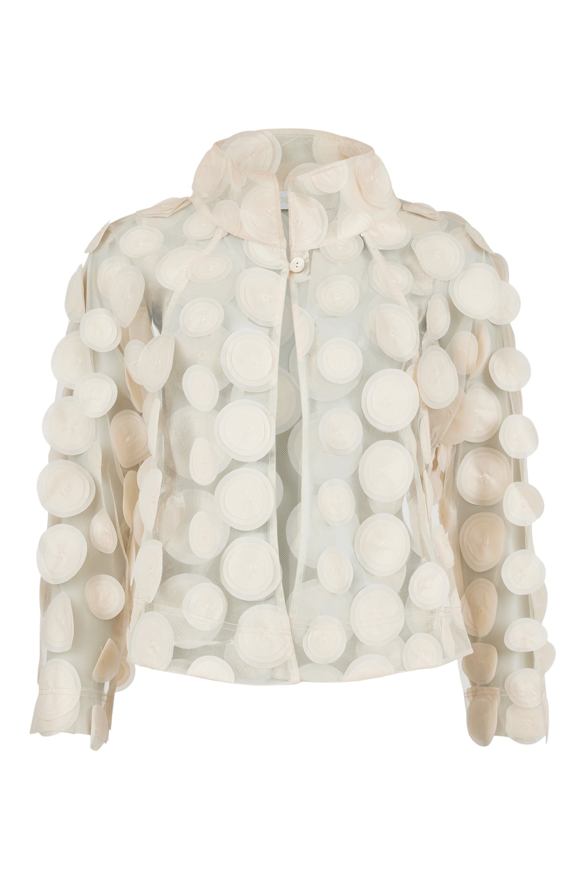 A striking piece, this disc jacket from Noen is sure to have heads turning your direction anywhere you go. This jacket has a button closure and a mock neckline. The delicate discs are sewn to the outside of the jacket, giving it a fashion-forward look.