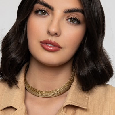 Chunky mesh necklace which can be worn choker style or torc style. Gold plating. Length 35 + 9cm extension.