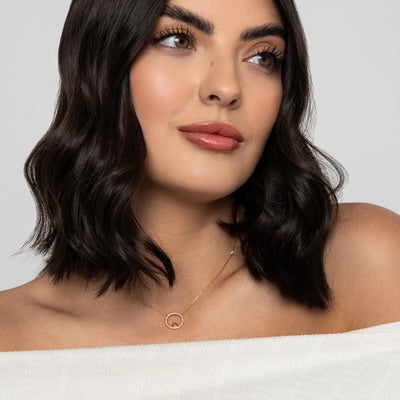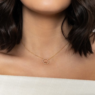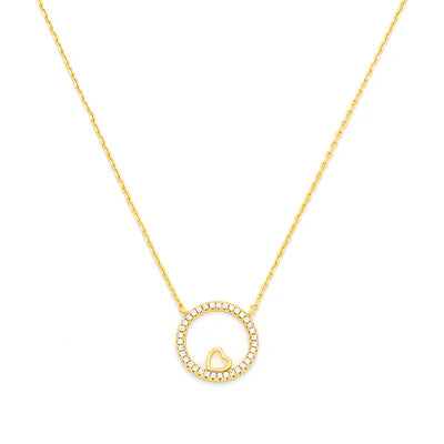 Miniature circle drop embellished with CZ stones and containing tiny gold heart. 18K gold plating. Length 16" +2" extension.