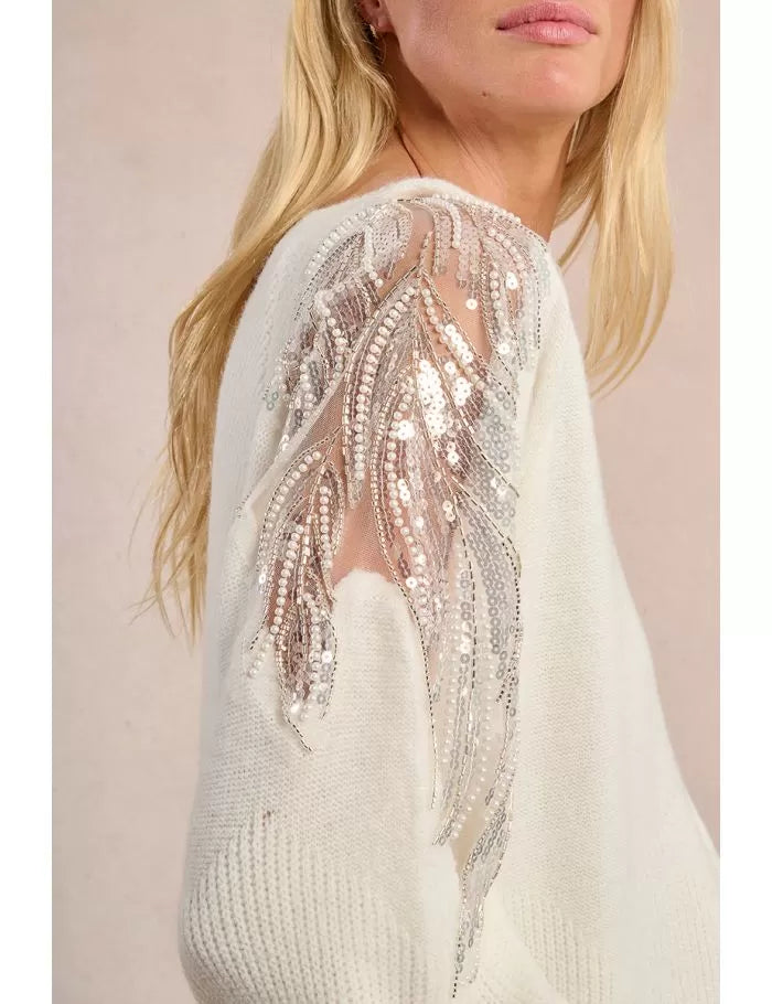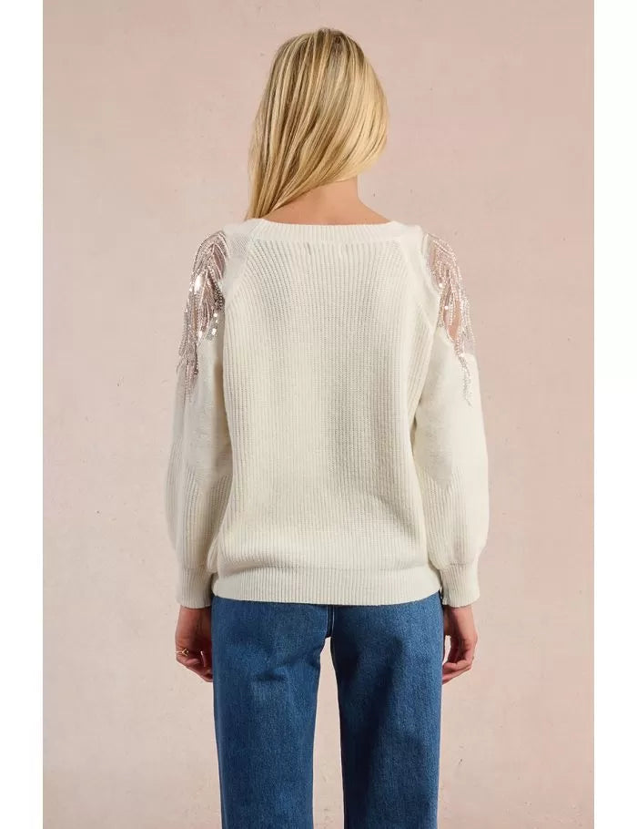 Open-Work Shoulder jumper from Molly Bracken is the perfect way to elevate any outfit. The open shoulder is create with a mesh material that is embellished with bead work. The sweater also features a round neck.