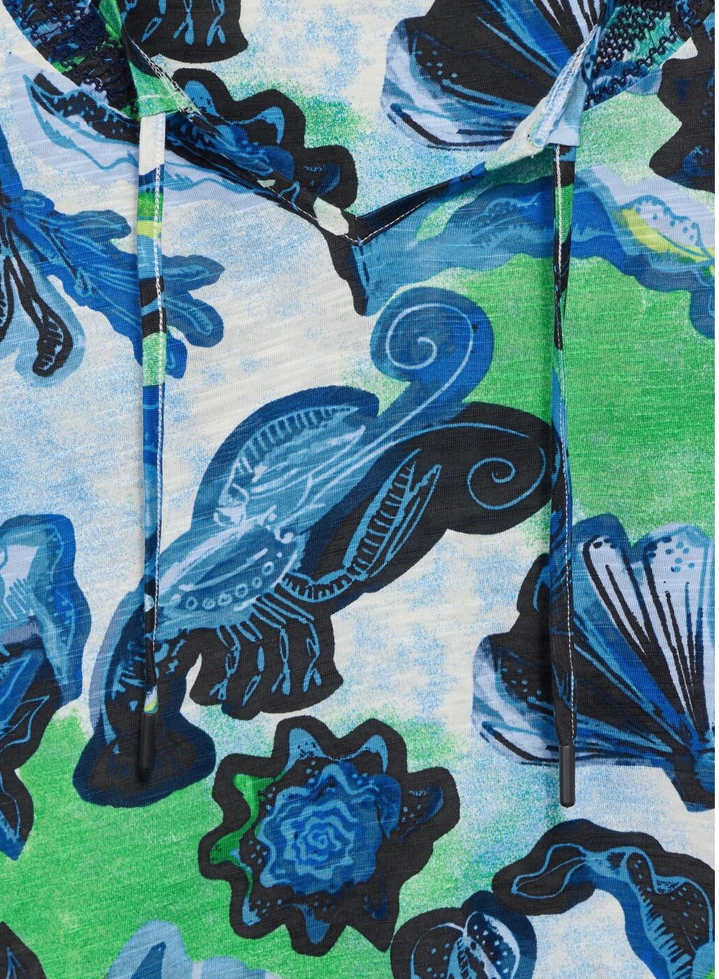 The tunic print T-shirt by CECIL for women is a fashionable summer shirt with short sleeves and a gathered neckline decorated with ribbons. Its multi-colored pattern gives it a cheerful look and makes it a versatile companion for warm days. Made of a soft cotton modal blend, it offers pleasant wearing comfort and is ideal for summer.