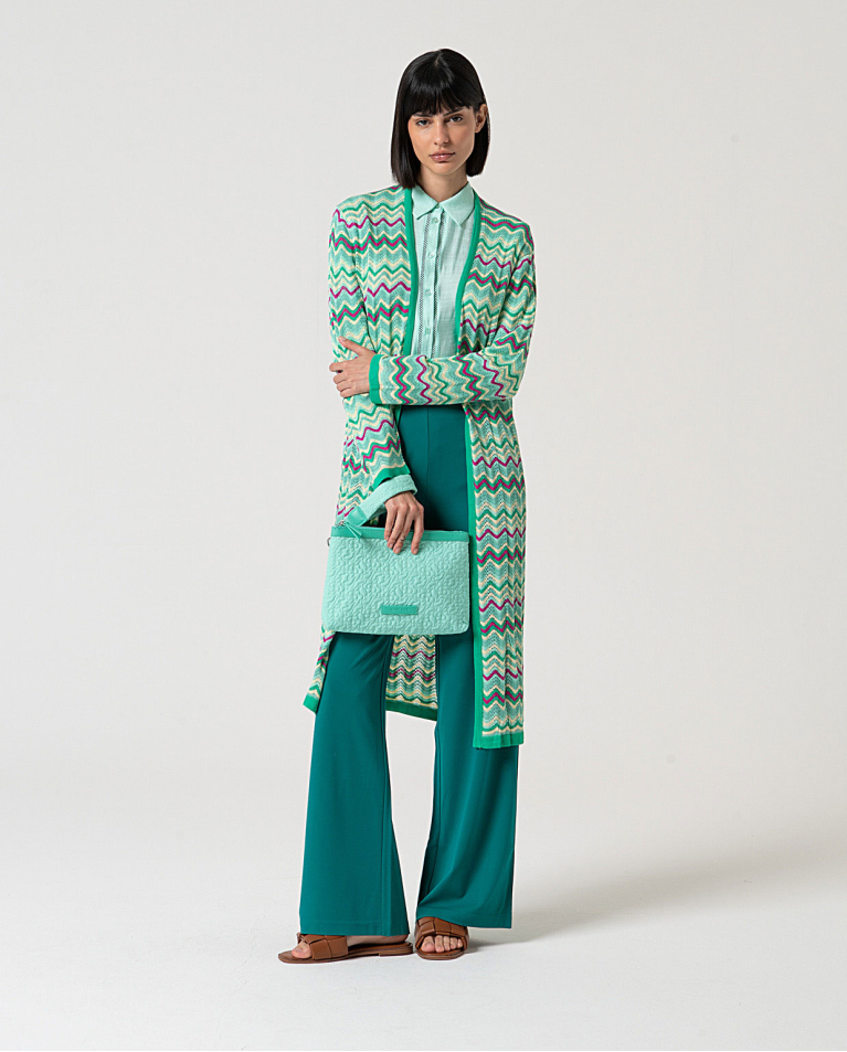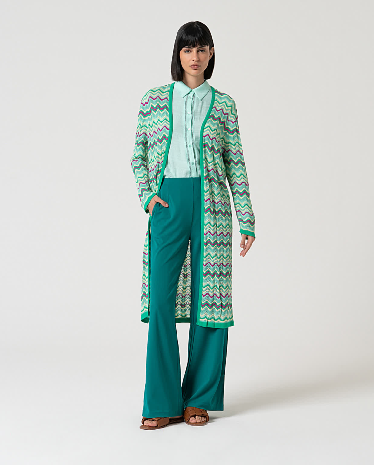 Knee-length open tricot cardigan with long sleeves. Made with 80%Viscose 20%Nylon.