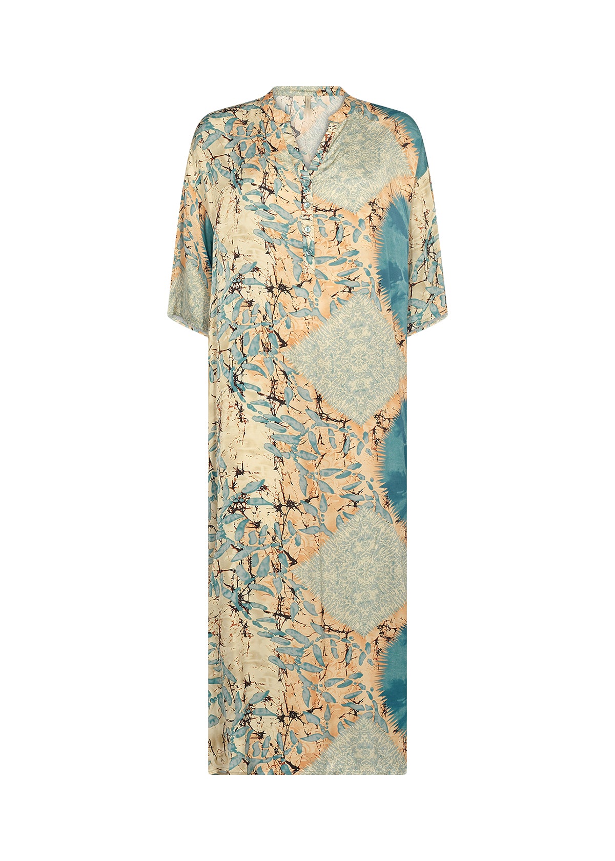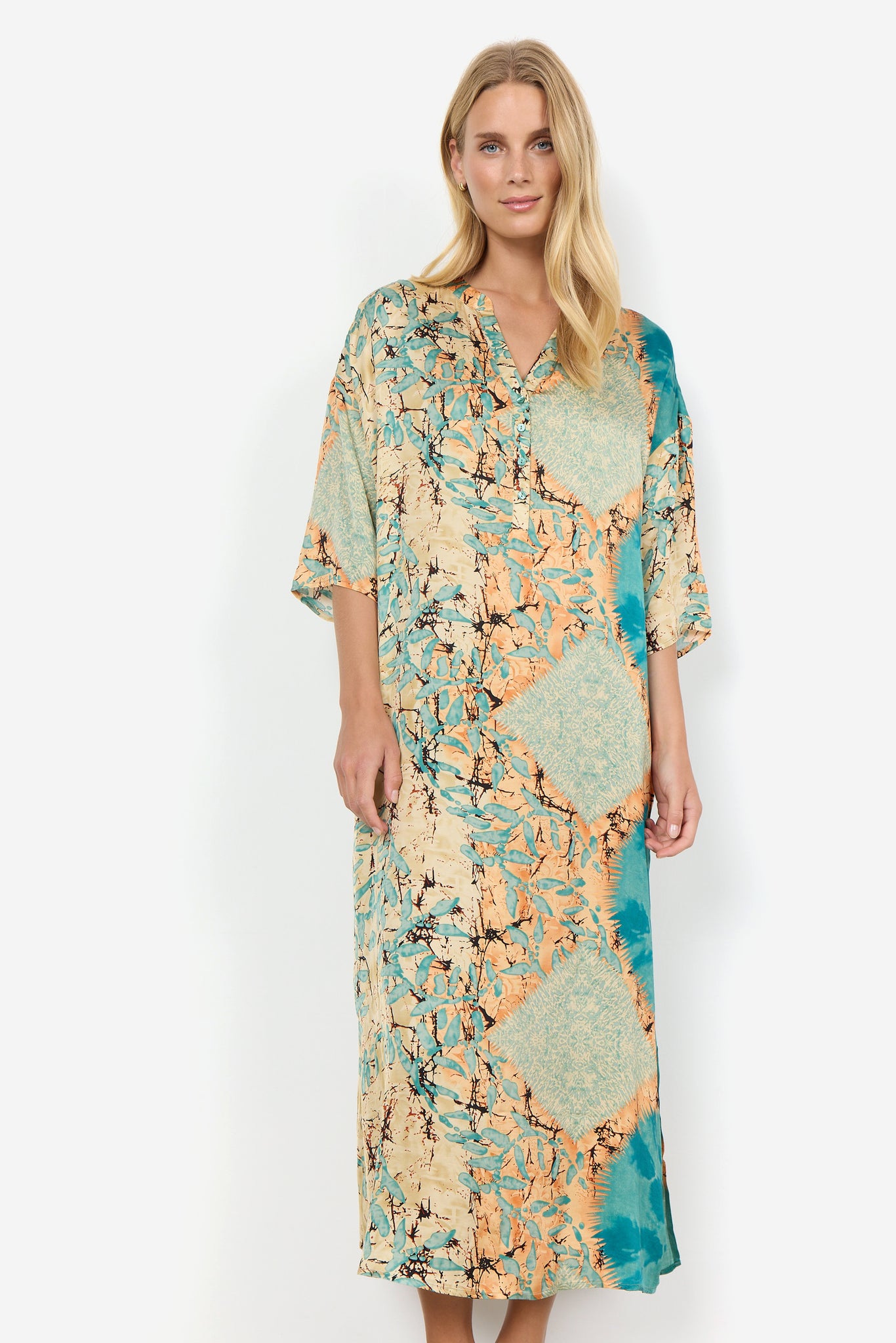 Description EN: SC-Emly 3 is a feminine dress made from a lovely blend of viscose and LENZING™ ECOVERO™ viscose. The dress has a feminine split-neck, a placket, 3/4 sleeves, a loose fit and a lovely print. Style this lovely dress with some heels and your favourite accessories for a formal look.