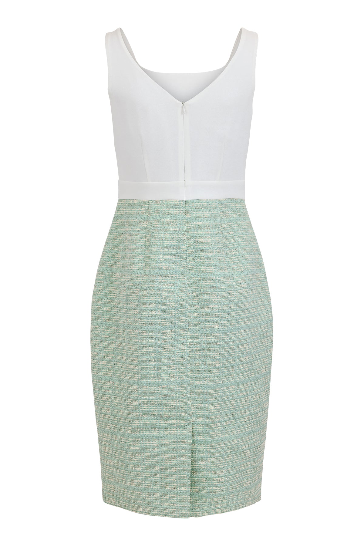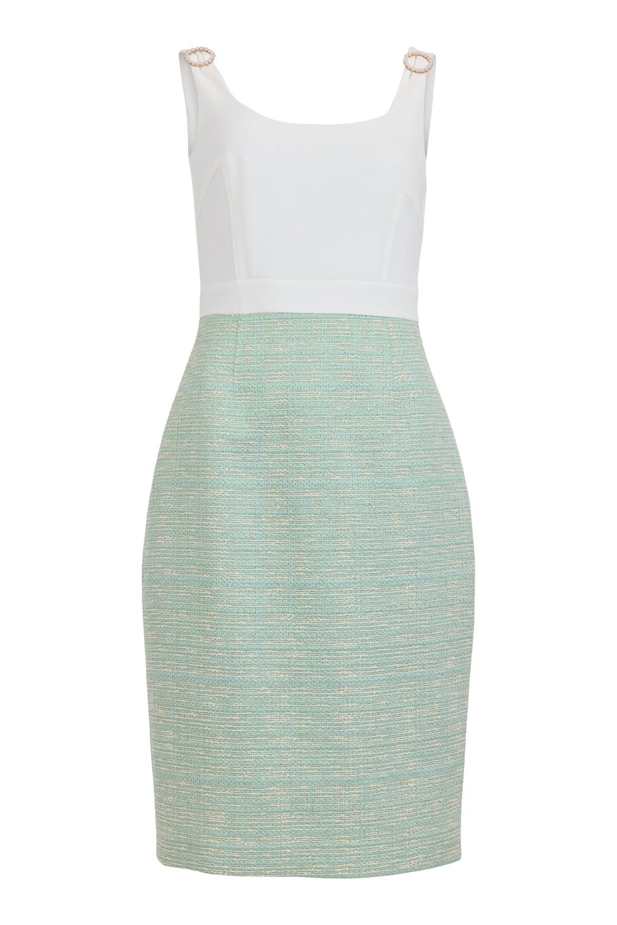 Elevate your wardrobe with our 78808-Mint Green Chanel Style Dress-Tia. This elegant dress features a beautiful mint green and cream color scheme, reminiscent of classic Chanel styles. The pearl detailing on the straps adds a touch of sophistication, making this a must-have for any stylish occasion.