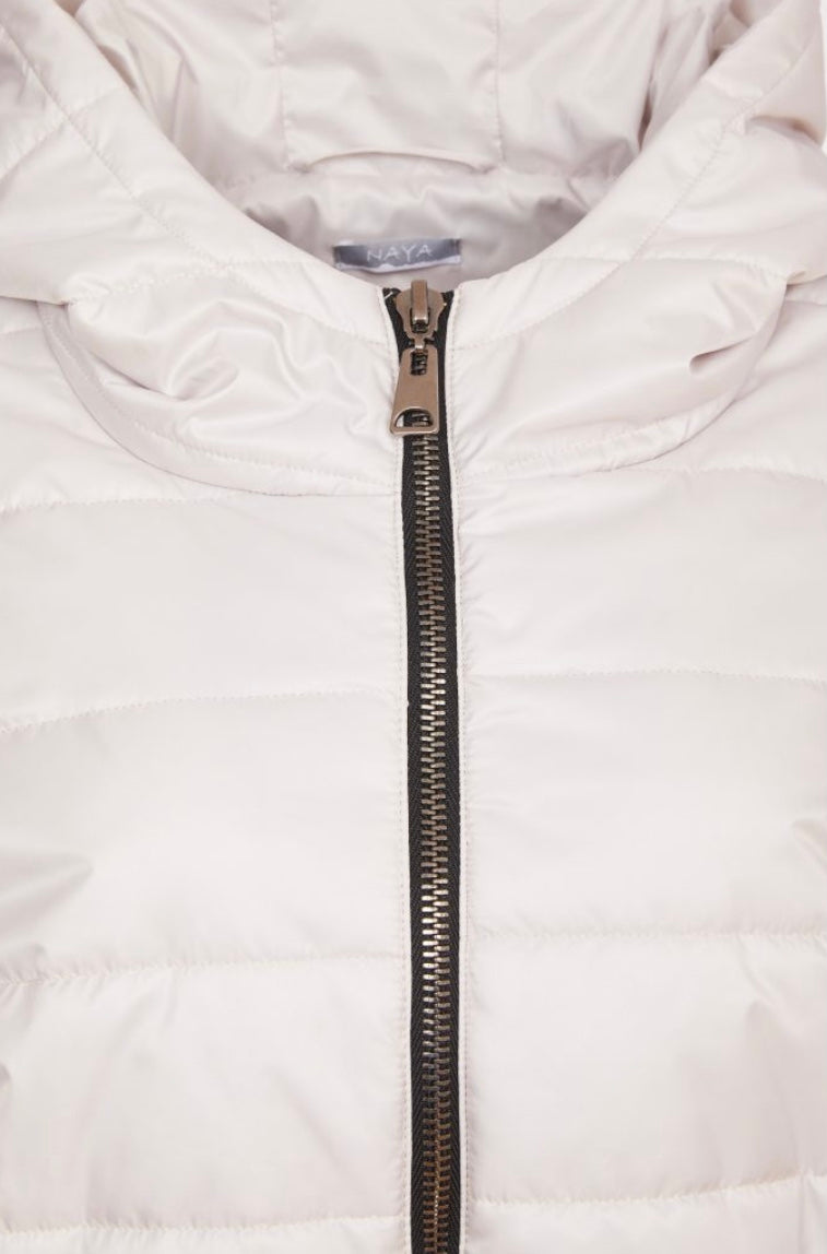 PADDED PERFECTION; NAYA introduce a stylish yet practical hip length padded jacket. This bulk free beautiful piece has a padded hood, short sleeves, and is finished with a contrast zip to the centre front and pockets.#NAYA #NAYASTOCKIST #NAYAIRELAND #NAYAUK #IRISHDESIGN