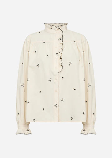 SC-VIBEN 1 Shirt is made from 100% organic cotton. It features a ruffled high collar, delicate front button closure, and floral embroidery. Pair it with tailored slacks or jeans for a casual yet stylish look.